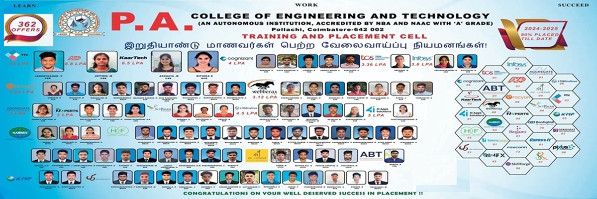 Read MoreP. A. College of Engineering and Technology of academic excellence was established by the Aruljothi Charitable Trust in 2008 by Professor and philanthropist Prof. Dr. P. Appukutty with the aim to provide value based, world class quality education to young aspirants of this rural region and impart technical and managerial skills of a high magnitude to meet the growing needs of the society.